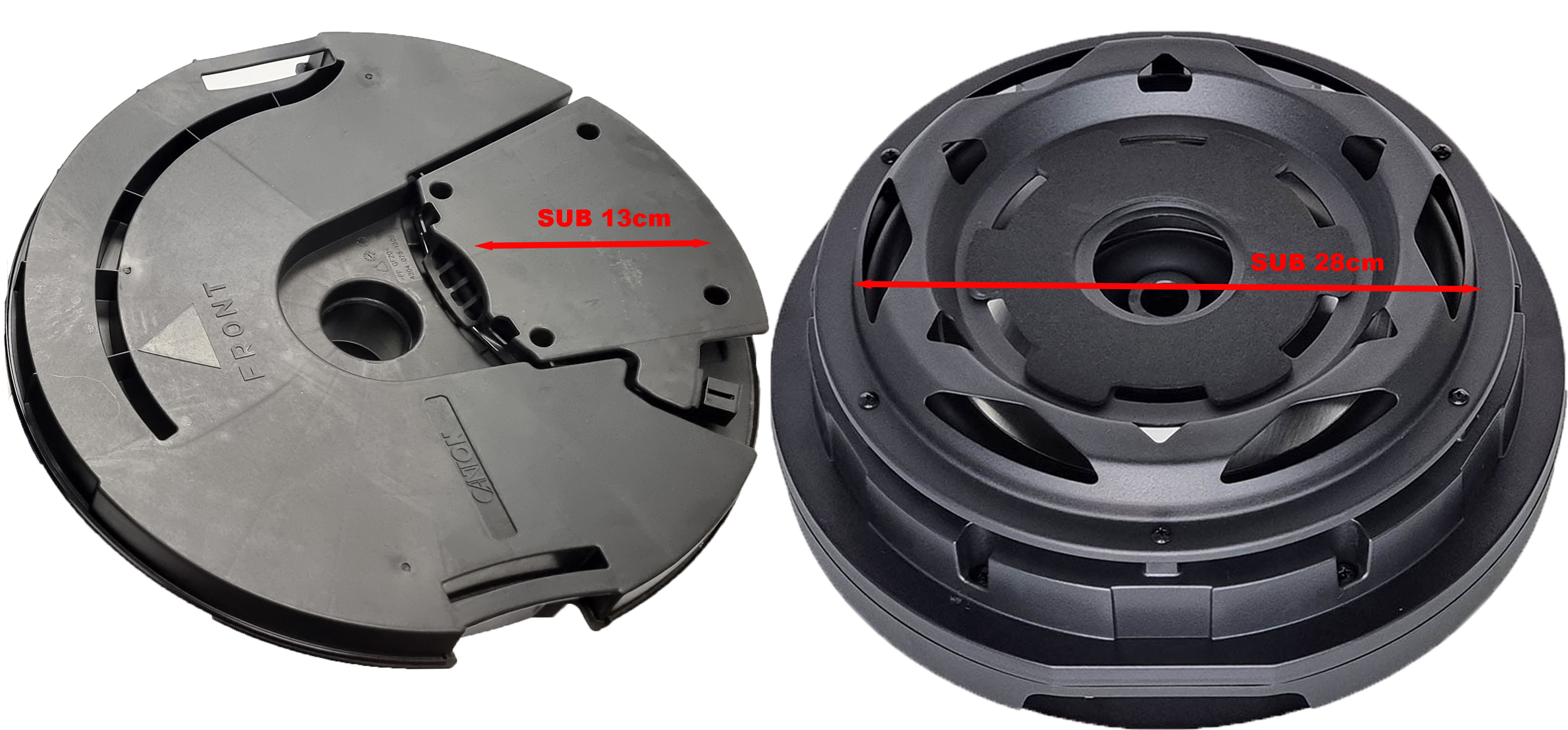 - Innowacyjny subwoofer 28cm mieszczący się do WNĘTRZA FELGI KOŁA ZAPASOWEGO!
