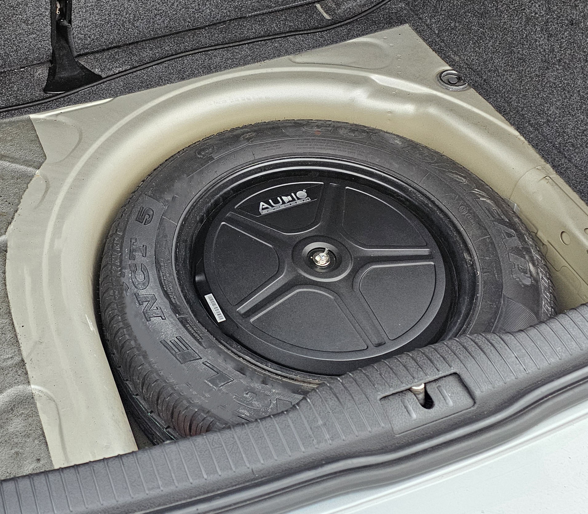 Innowacyjny płaski subwoofer (zaledwie 13,5cm grubości) do WNĘTRZA FELGI KOŁA ZAPASOWEGO!
