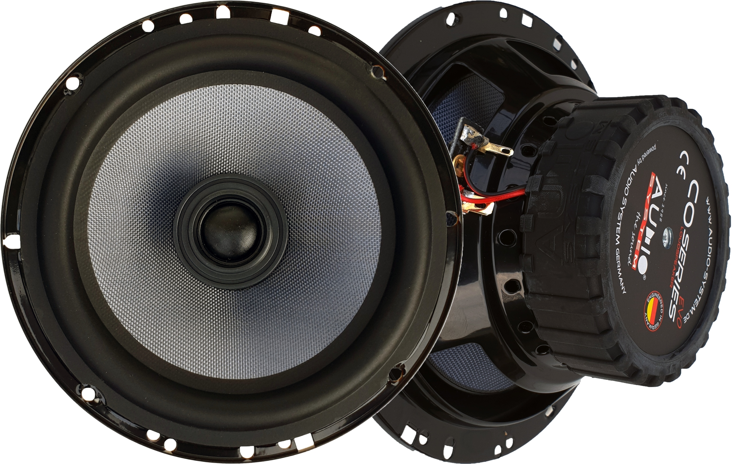 Dwa głośniki Audio System CO165EVO z membraną ze szlachetnej plecionki włókna szklanego, jedwabnymi dużymi tweeterami 19mm i podwójnej wielkości magnesem HEM.