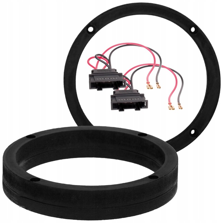 W komplecie dystanse MDF (impregnowane i lakierowane) i wiązki PnP do wooferów, do oryginalnej instalacji, zakończone konektorami do głośników