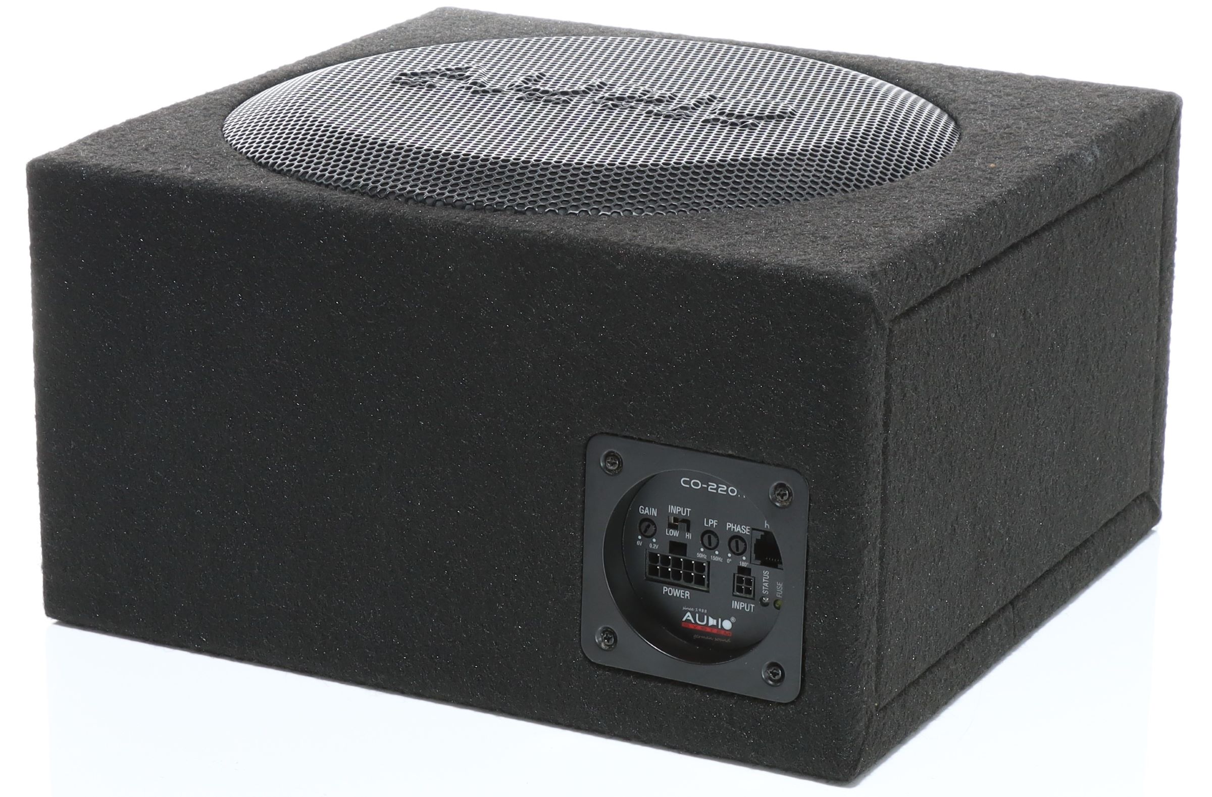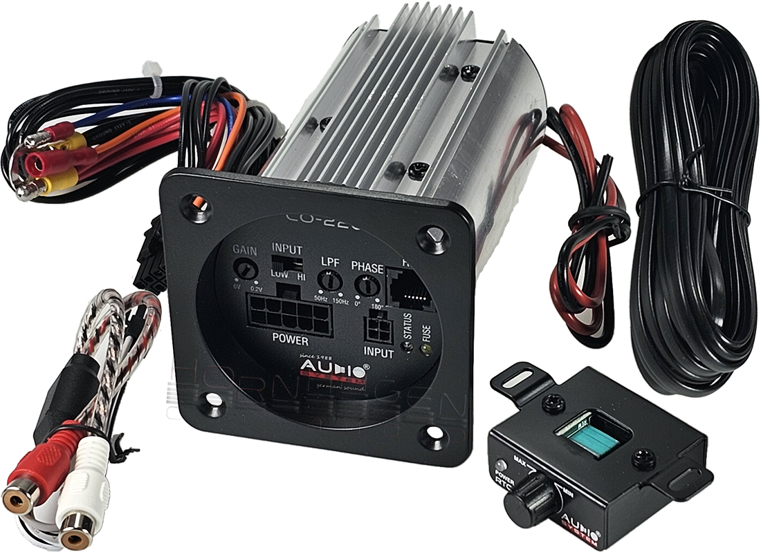 - Wzmacniacz Audio System CO-220.1 do wbudowania w obudowę basową, z pilotem sterowania basu i wiązką zasilającą.